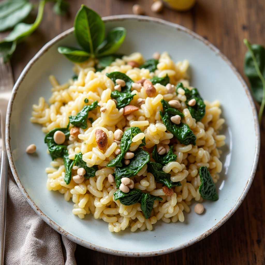 - Una vez que el risotto esté listo, agrega las espinacas, la mantequilla y una cucharadita de piñones tostados (si lo deseas). Revuelve suavemente para integrar todos los ingredientes.