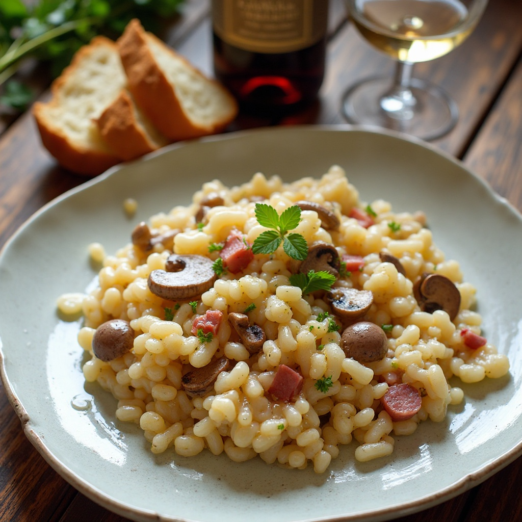 Este risotto es una opción saludable debido al uso de arroz integral, que proporciona energía y fibra. Los ingredientes como el jamón ibérico aportan proteínas, y el Lambrusco y los champiñones ofrecen antioxidantes. Asegúrate de elegir un caldo de verduras bajo en sal si prefieres una versión más ligera.