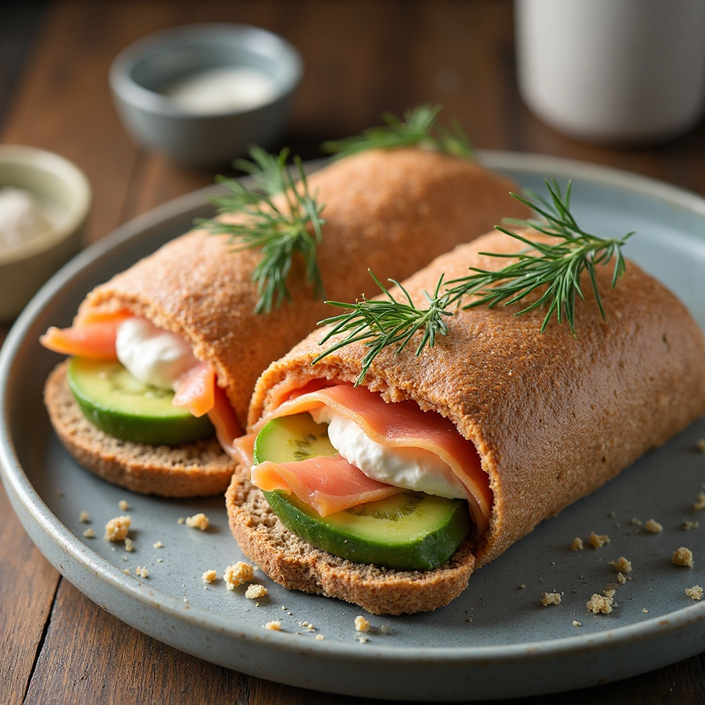 - Monta los Rolls: coloca un poco de crema agria en la base de un trozo de pan de centeno, luego añade el salmón, una lámina de aguacate, y una pequeña cantidad de pepino si lo deseas. Espolvorea con eneldo fresco.