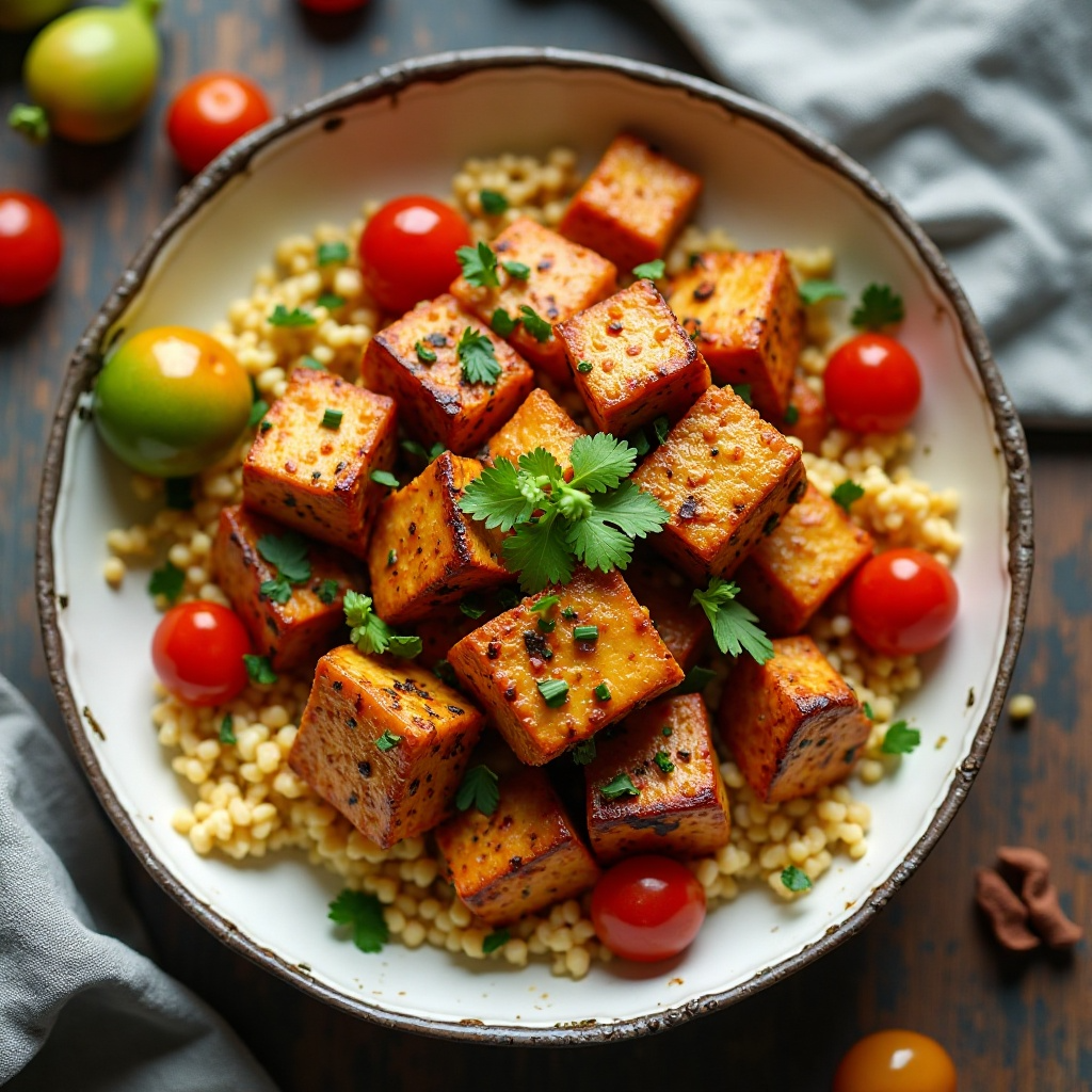 Este plato es una opción saludable debido a su contenido de proteínas vegetales en forma de tofu y vegetales ricos en antioxidantes. La elección de especias como el comino y el pimentón proporciona beneficios para la salud del corazón y el sistema digestivo. El aceite de oliva contribuye con ácidos grasos monoinsaturados beneficiosos.