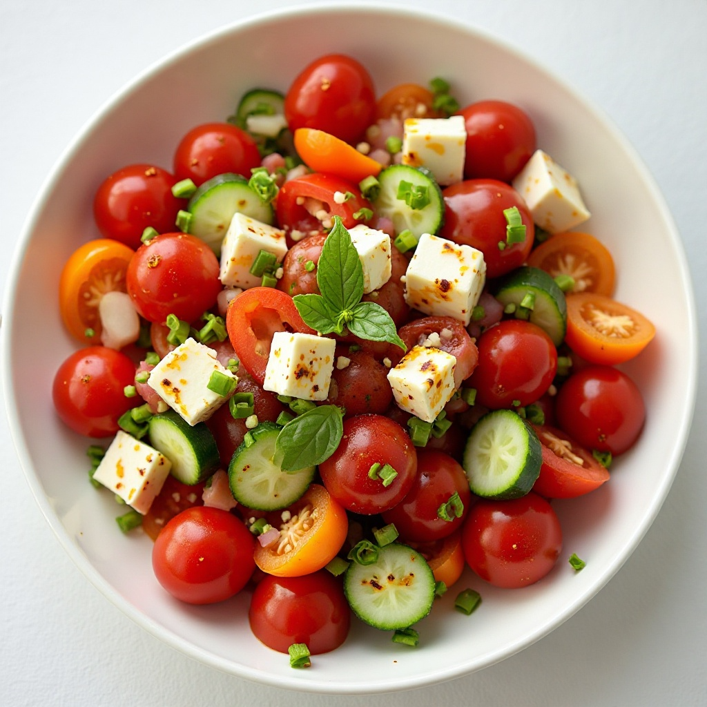 Esta ensalada es rica en antioxidantes gracias a los tomates y las verduras frescas. El queso Mahón, aunque salado, es bajo en grasa, lo que la hace una opción saludable. Se recomienda consumirla con moderación por el contenido de sal del queso.