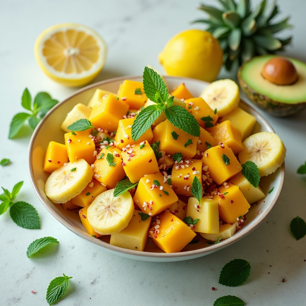 Esta salada es rica en vitaminas y antioxidantes debido a sus frutas tropicales, como el mango y la piña. El jugo de limón agrega un toque ácido saludable y ayuda a mejorar la digestión. Para aquellos con restricciones dietéticas, esta receta es naturalmente libre de gluten, lactosa y puede ser modificada reduciendo o eliminando el aceite de oliva.