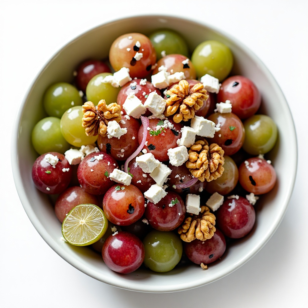- En un tazón, mezcla las uvas, el queso feta, la cebolla morada y las nueces. Salpimienta al gusto.