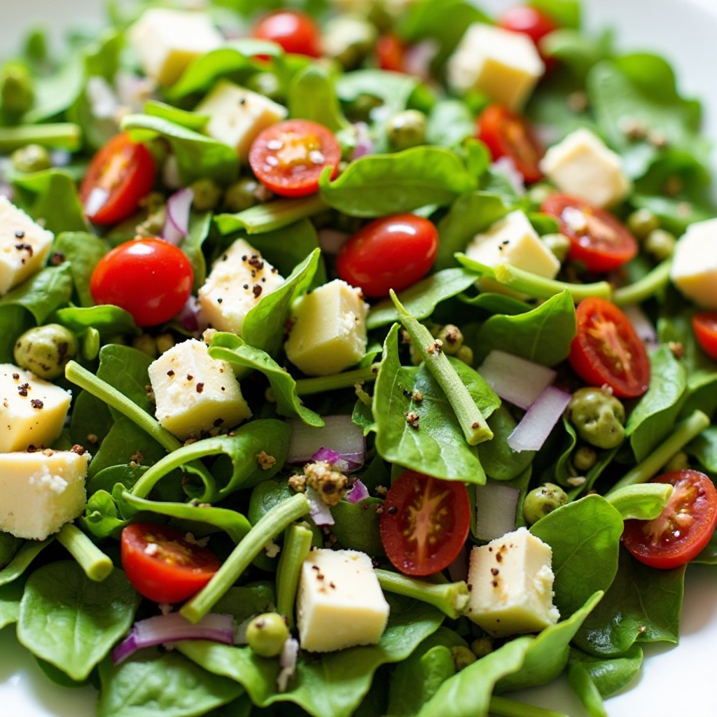 - Coloca las hojas de Watercress en un plato hondo y agrega los cubos de queso Gloucester. Distribuye las rodajas de tomate cherry y la cebolla picada uniformemente sobre el resto de los ingredientes.