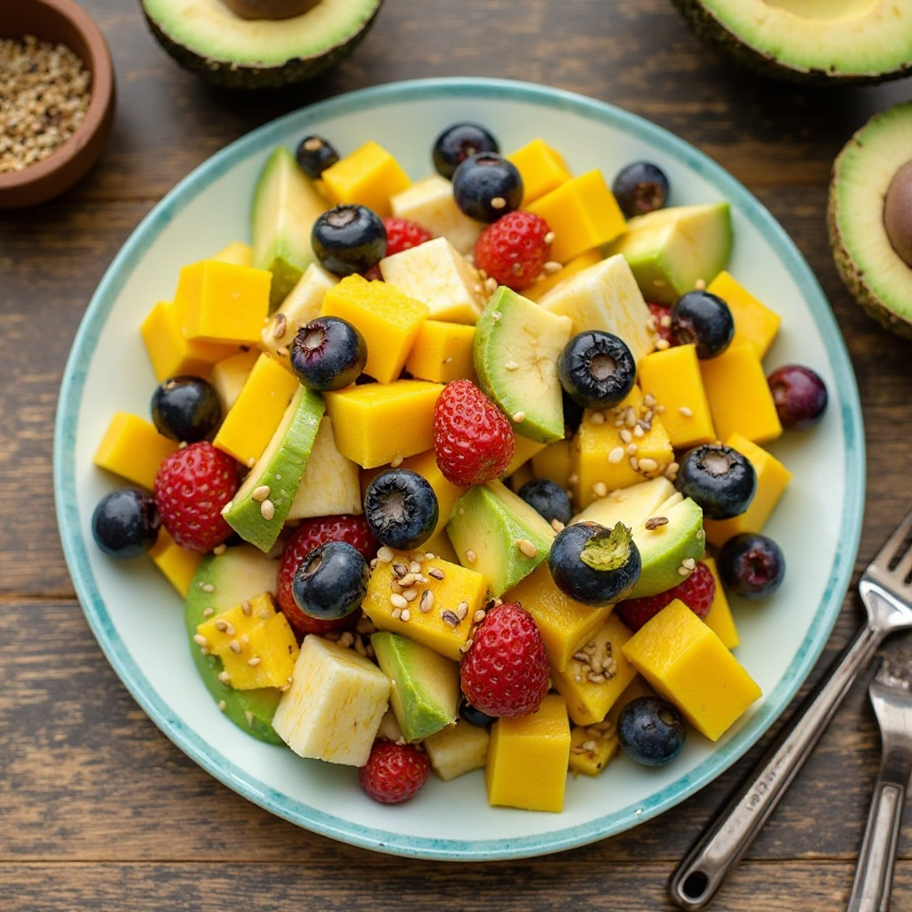 Esta Saladita Tropical es baja en calorías y rica en vitaminas A y C, gracias a las frutas tropicales que contiene. El aguacate aporta grasas saludables, mientras que los arándanos o fresas ofrecen antioxidantes adicionales. Es una opción perfecta para aquellos que buscan una comida ligera, saludable y llena de sabor.