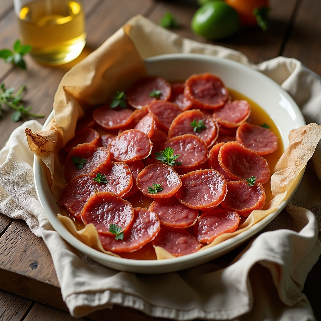 - Cierra el horno a 180°C (350°F) y cocina los salames y speck durante 20-25 minutos, o hasta que estén tiernos y hayan absorbido un poco del vino. Verifica cada 5 minutos para asegurarte de no quemar los ingredientes.