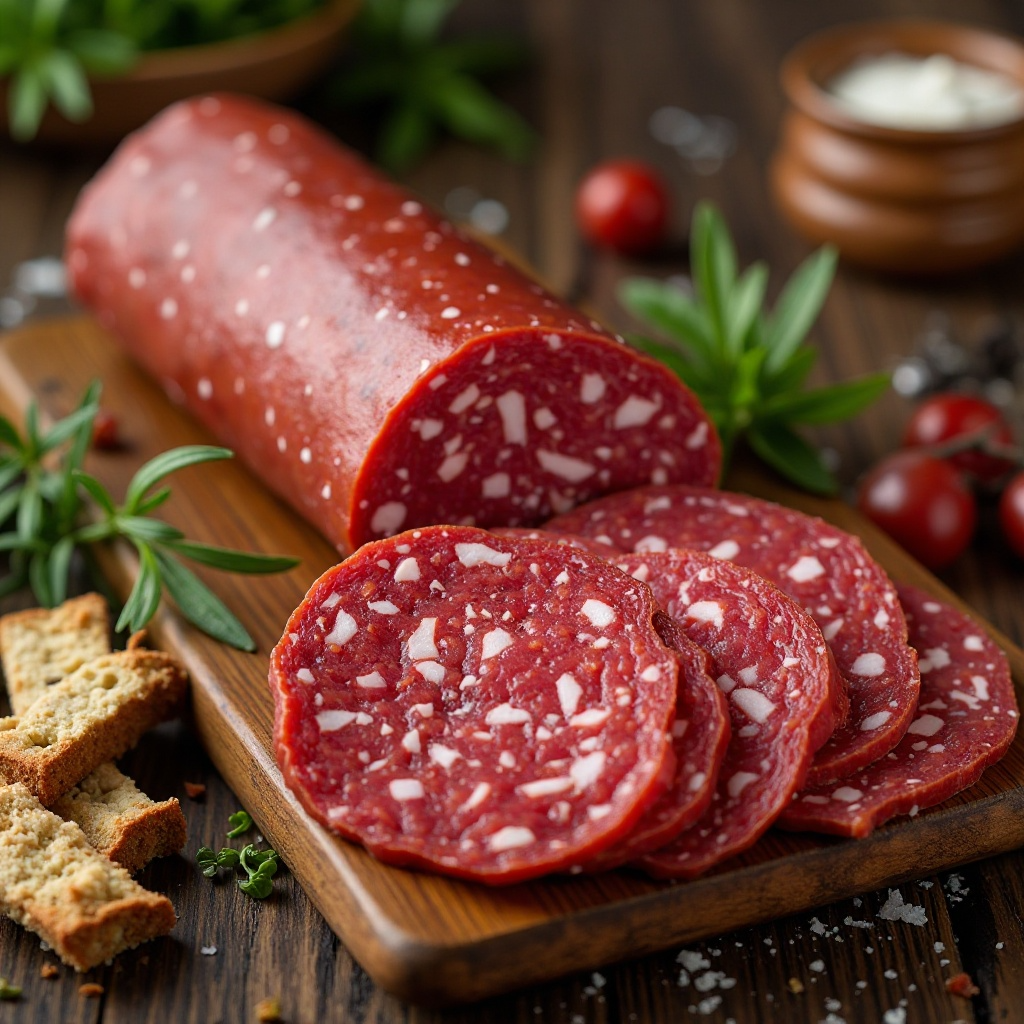 7. Una vez curado, corta el Salami alla Beneventana en rodajas finas y disfrútalo como aperitivo o plato principal, junto con una ensalada o pan tradicional italiano.