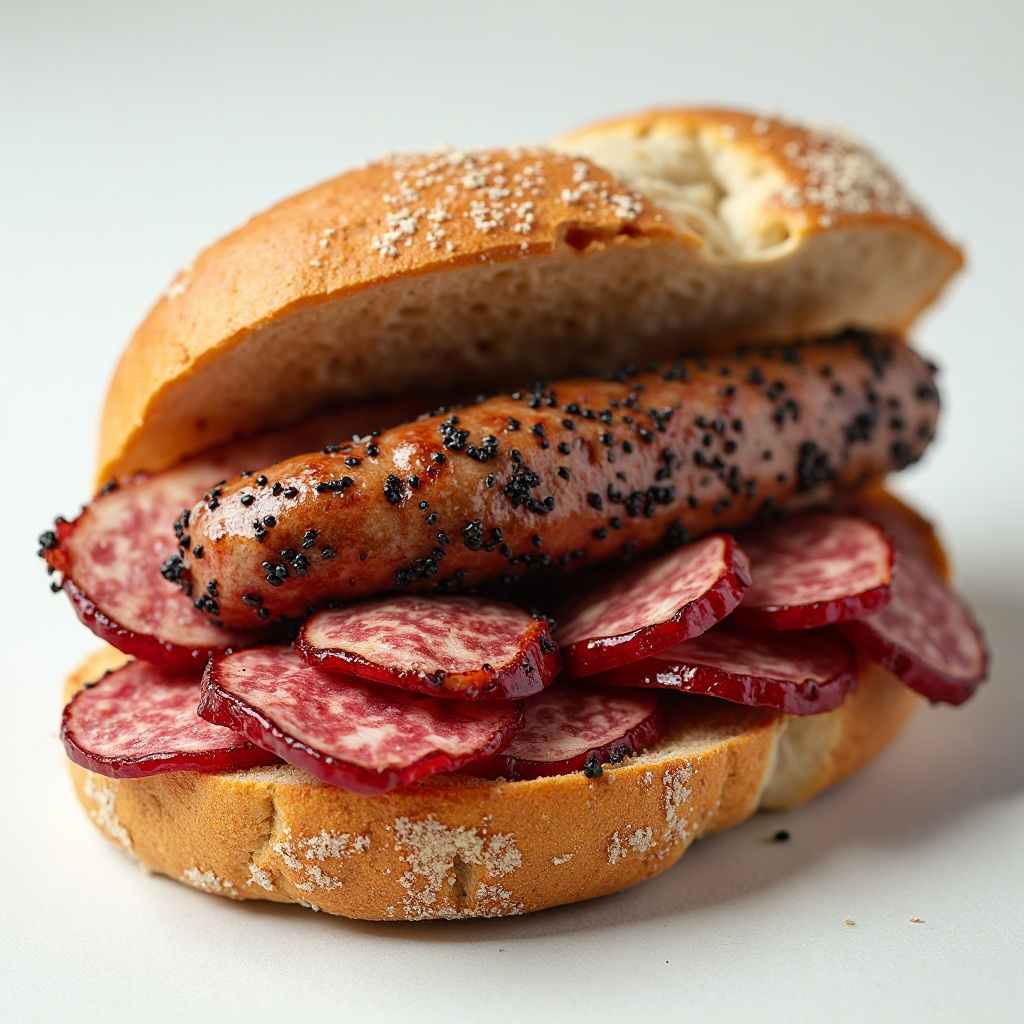 Este sándwich es una opción deliciosa pero rica en calorías debido a la carne de cordero y la kielbasa. Para reducir la grasa, puedes optar por una versión con menos kielbasa o elegir una más baja en grasa. Además, el uso de pan bielski con corteza gruesa ayuda a controlar el apetito. Los ingredientes como las semillas de mostaza negra y sésamo negro añaden un toque saludable con sus propiedades antioxidantes.