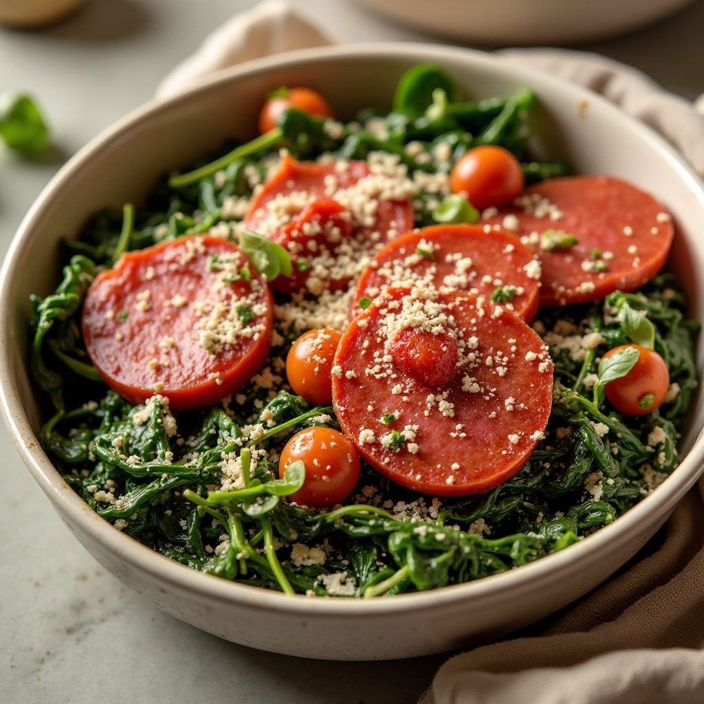 Este plato es rico en proteínas y contiene nutrientes esenciales provenientes de las espinacas. El salame di Norcia, aunque es una carne salada, proporciona beneficios nutricionales con su contenido de vitaminas B y minerales como el hierro. Asegúrate de elegir un queso parmesano sin aditivos innecesarios para mantener la integridad nutricional del plato.