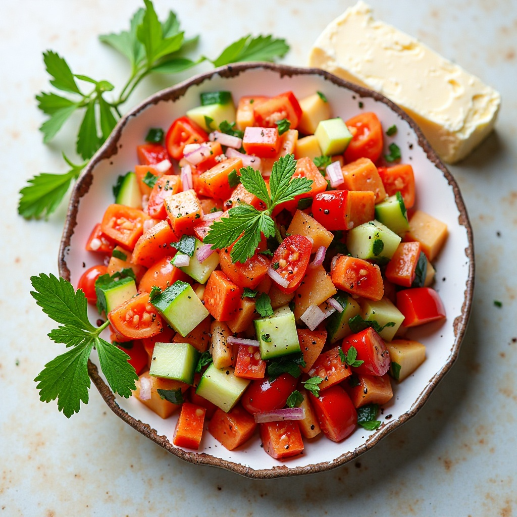 La sălață de ciorba es una salada tradicional rumana que se disfruta especialmente en Rumanía. Esta versión incluye queso de Sălăj, un queso fresco y afrutado que le da a la receta su distintivo sabor. Ideal para compartir con amigos y familia en una tarde soleada o como plato principal con pan rumano.
