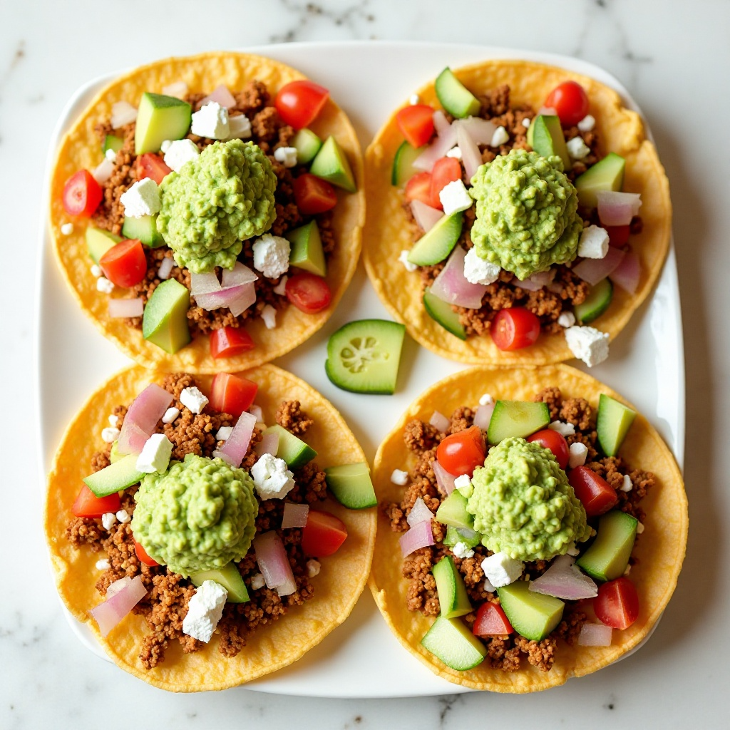 - Para cada salbute, coloca una tortilla tostada en un plato y añade la mezcla de ingredientes sobre ella.