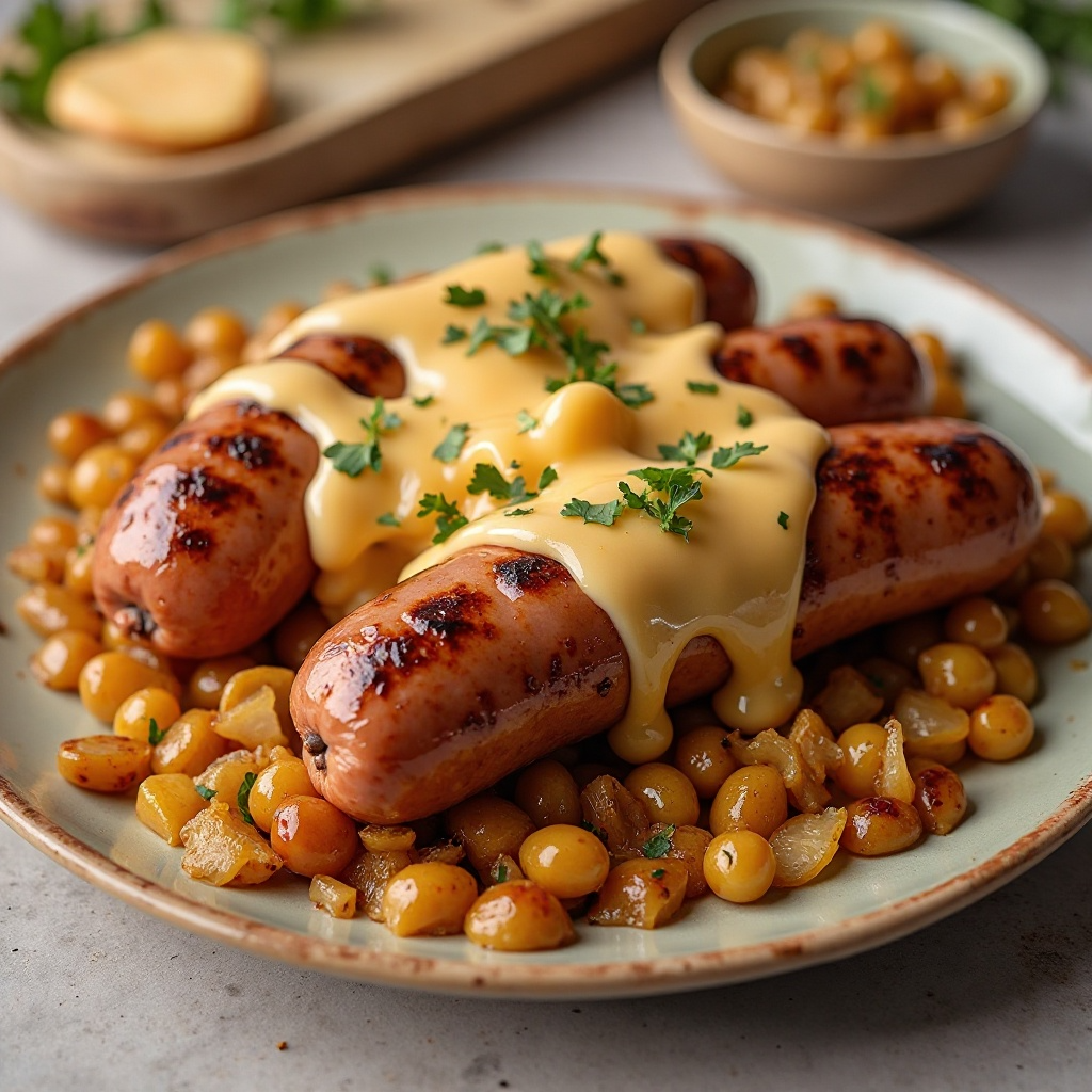 - Sirve la mezcla de patatas y cebolla en un plato, y coloca las salchichas encima, dejando un espacio para el queso.