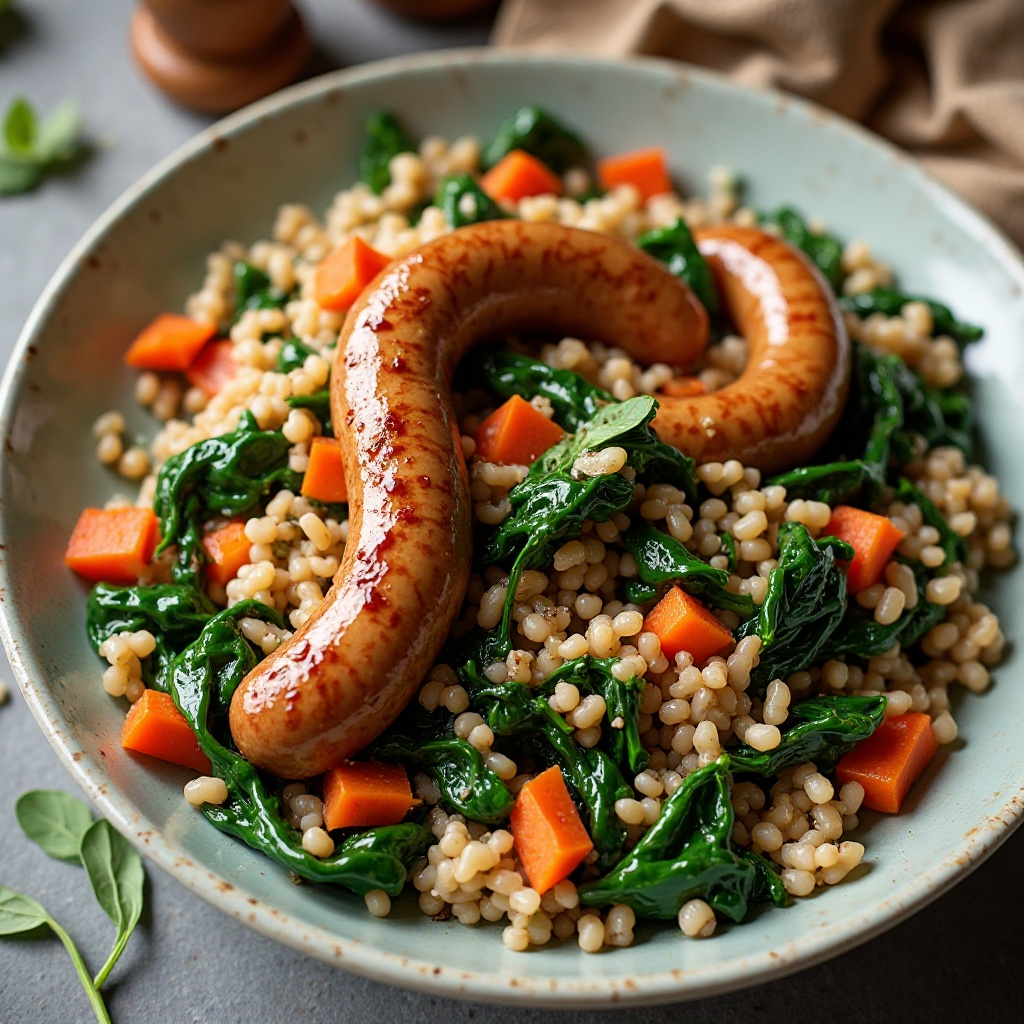 - Sirve caliente la mezcla en platos individuales, disfrutando de las salchichas de Burgas junto con los beneficios nutricionales de las espinacas y el arroz integral.