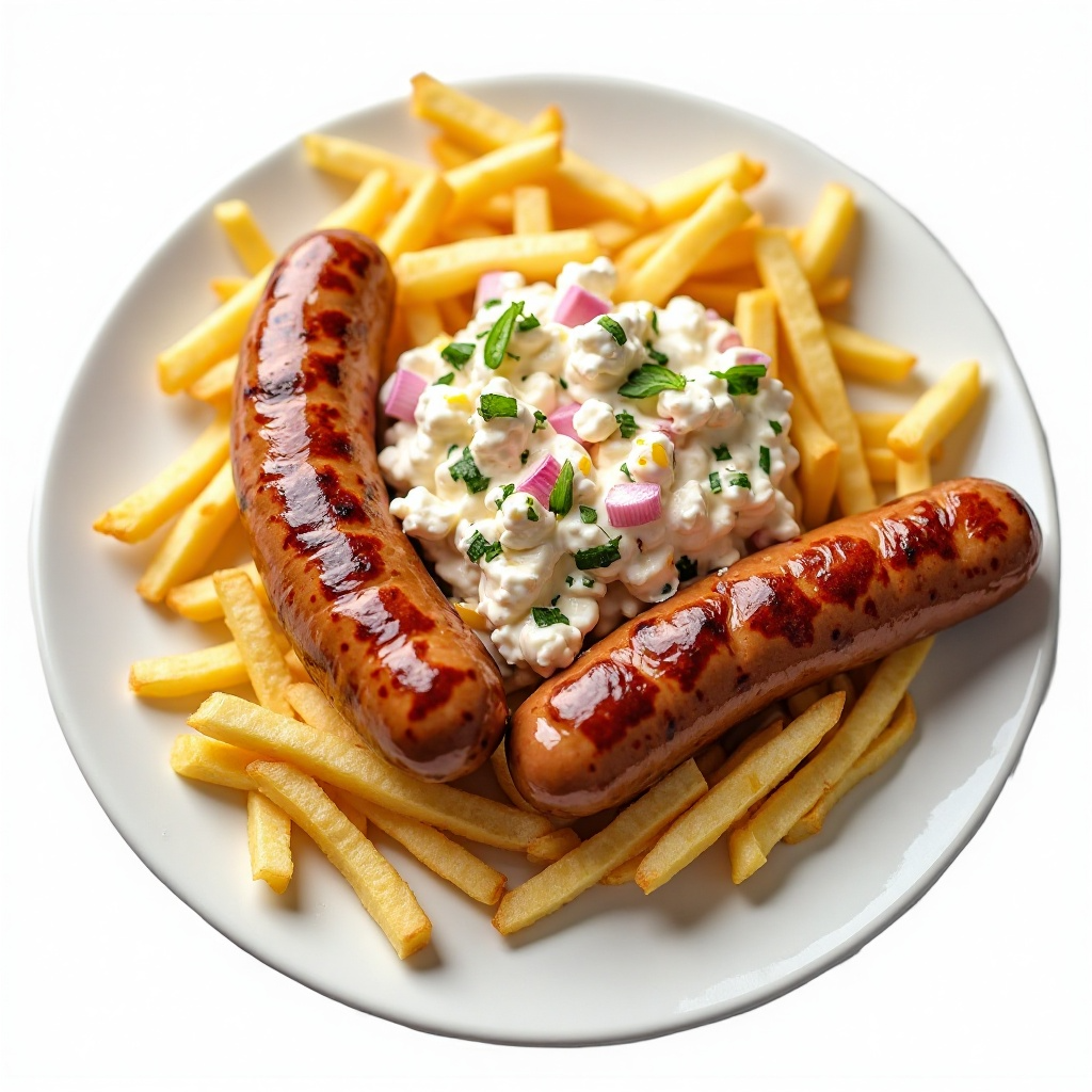Las salchichas de Subotica son un plato tradicional de Serbia, conocido por su sabor robusto y textura jugosa. Esta receta ofrece una presentación clásica que incluye papas fritas y ensalada rusa, elementos esenciales para complementar el perfil intenso de las salchichas.