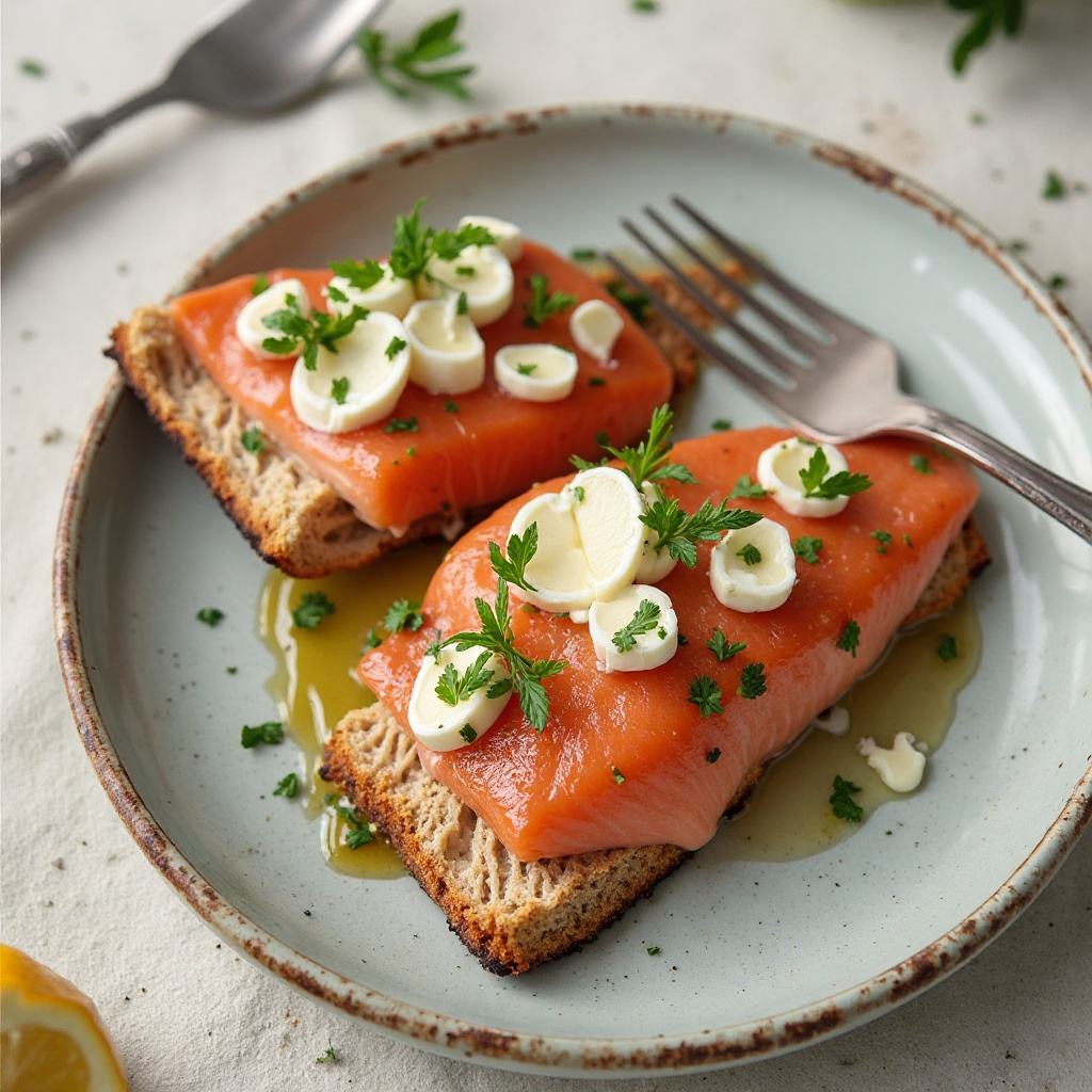 5. Sirve inmediatamente, permitiendo que el queso funda suavemente sobre el salmón. Acompaña con pan integral o crispeado para una textura crujiente y complementaria.