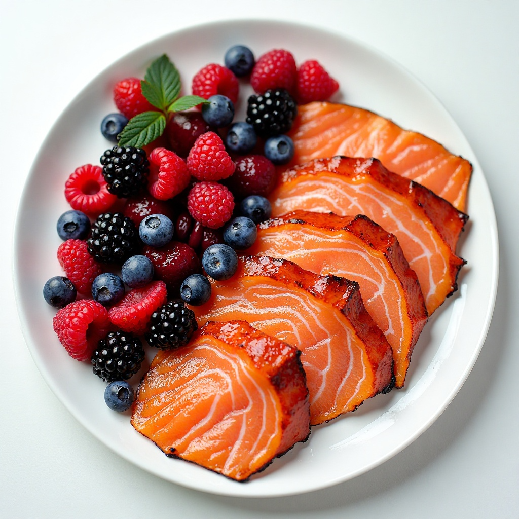 El salmón ahumado es una fuente rica de omega-3, que es beneficioso para la salud cardiovascular. Las frutas del bosque son bajas en calorías y altas en antioxidantes, lo que puede ayudar a proteger contra enfermedades crónicas. Este plato es un equilibrio perfecto entre proteínas, carbohidratos y antioxidantes, perfecto para una dieta saludable.