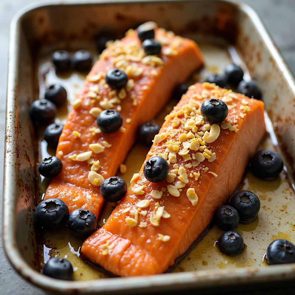 3. Coloca los filetes de salmón en la bandeja para hornear y rocía con la salsa preparada, asegurándote de que ambos estén cubiertos por igual. Tuesta los arándanos en un sartén a fuego medio hasta que estén suaves, aproximadamente 3 minutos.