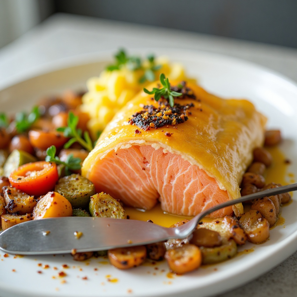 El salmon es rico en omega-3, conocido por sus beneficios para la salud cardiovascular. La mantequilla utilizada aquí proporciona un toque de sabor pero es importante consumir con moderación debido a su contenido de grasa saturada. Para una versión más saludable, puedes optar por una mantequilla light o usar aceite de oliva en lugar de mantequilla.