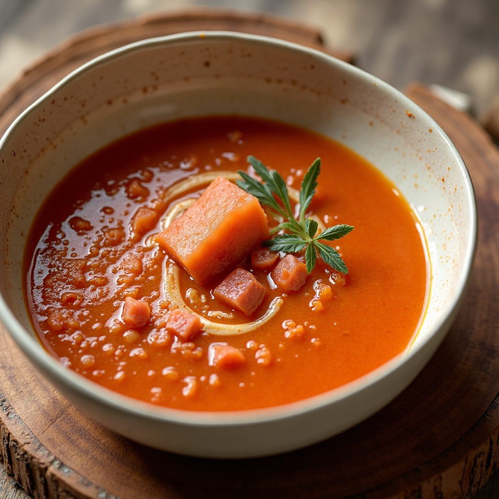 La tradición del salmorejo se remonta a la España rural, donde se disfrutaba como una sopa ligera y refrescante. El uso del atún rojo de almadraba no es común en esta receta tradicional, pero en San Roque, especialmente en las zonas costeras de Andalucía, la cocina busca fusionar lo típico con lo sofisticado, celebrando tanto la cultura como la exquisitez culinaria. Este plato no solo satisface el paladar sino que también simboliza la generosidad y alegría propias de estas festividades.