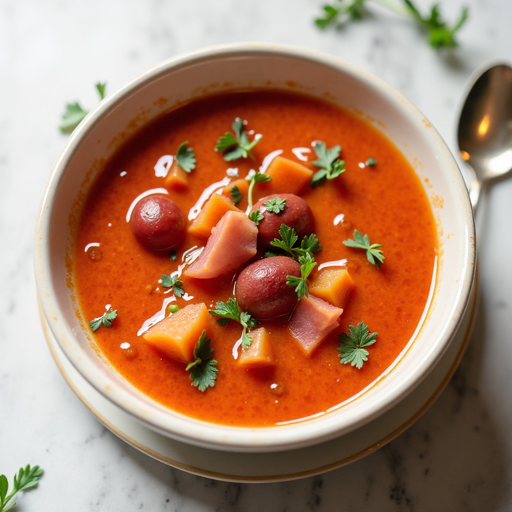 La elección del jamón de Teruel en este salmorejo es un homenaje a los productos locales de Aragón, España. Este jamón, famoso por su sabor terroso y robusto, se complementa a la perfección con las notas frescas de las aceitunas y el tomate, típicas del sur de España. La incorporación de estos productos regionales refleja la rica tradición culinaria de la Península Ibérica, donde los sabores de diferentes regiones se entrelazan para crear platos únicos e irresistibles.