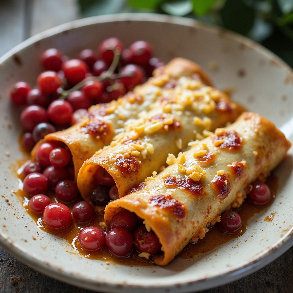 - Coloca las enchiladas en platos individuales, vierte la salsa de Chokecherry sobre cada una, y añade queso fino cubriendo las enchiladas hasta que se funda y forme una capa crujiente en el horno a 200°C por 5 minutos.