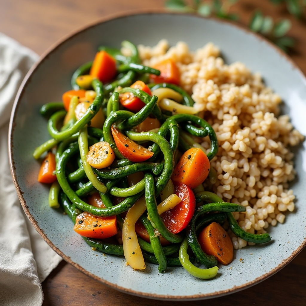 Receta de Salteado de Fiddleheads y Verduras con Arroz Integral