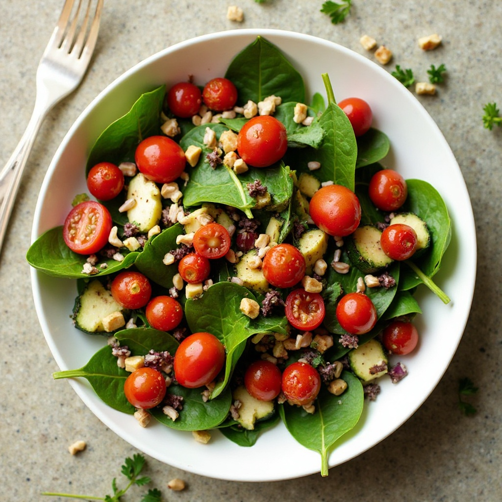 - Agrega los tomates cherry, el pepino, la cebolla roja, el pimiento rojo y el calabacín a las espinacas. Mezcla suavemente.