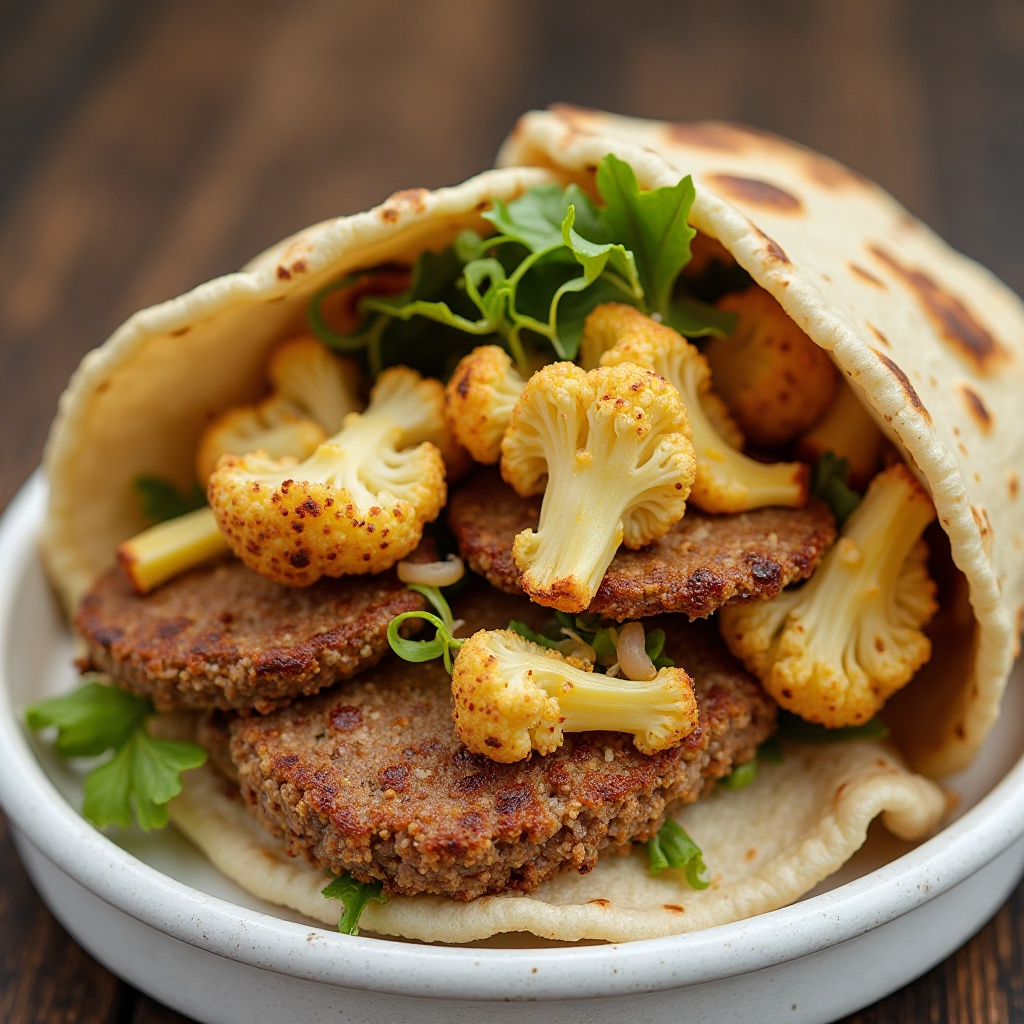 - Monta los sandwiches: coloca una tortilla en cada plato, coloca una rebanada de goetta, seguido de la coliflor asada. Cubre con mayonesa, mostaza y lechuga. Completa el sandwich con la otra tortilla.