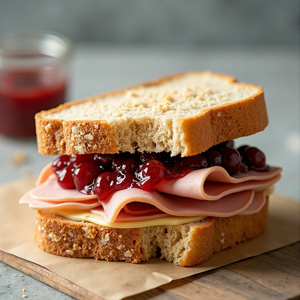 La mantequilla de macadamia es rica en grasas saludables, siendo una excelente fuente de grasas monoinsaturadas. La mermelada de uvas aporta un toque dulce y también contiene antioxidantes. Para mantener un sándwich equilibrado, considera usar pan integral o optar por una opción baja en sodio para el jamón.