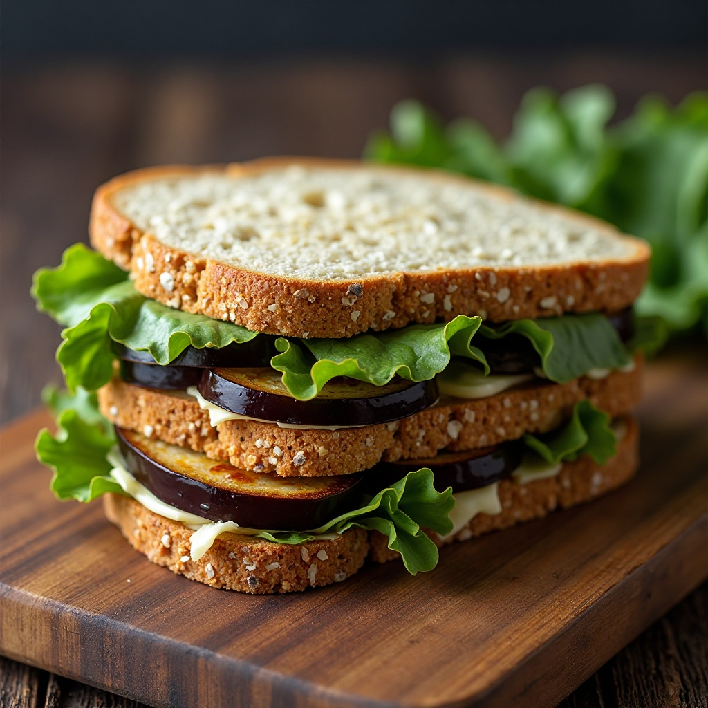 El Queso Adygea es bajo en grasa, lo que lo convierte en una opción saludable para incluir en dietas conscientes. Las berenjenas son ricas en antioxidantes y fibra, contribuyendo a un sándwich equilibrado desde el punto de vista nutricional. El pan integral y las hojas de lechuga añaden complejidad nutricional y textura al sándwich.