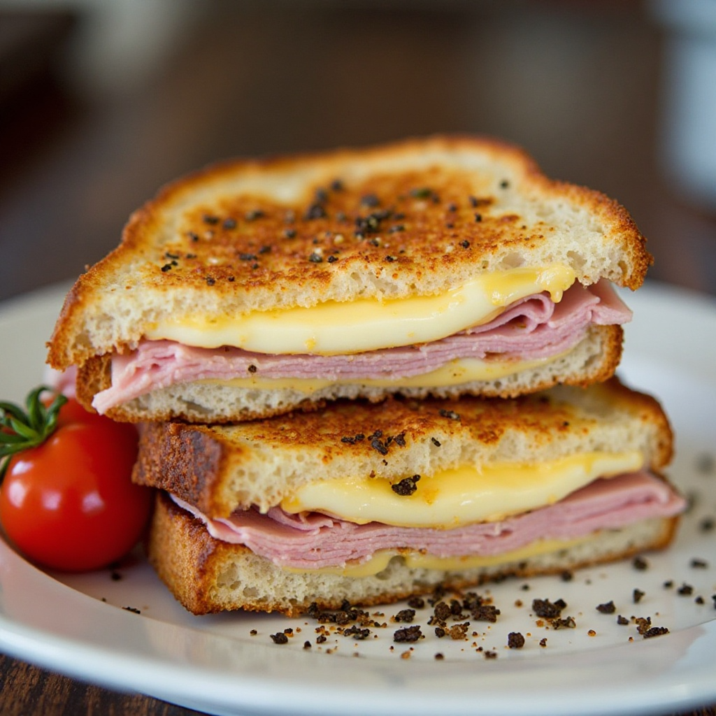 6. Calienta una sartén grande sin aceite hasta que esté caliente. Coloca el sándwich en la sartén y cocina hasta que las rebanadas de pan estén doradas y crujientes, alrededor de 2-3 minutos por lado. Verifica que el queso se haya derretido uniformemente y que el jamón esté cocinado.