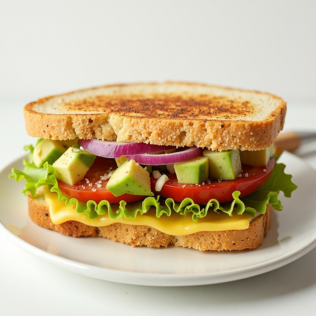 Este sándwich ofrece una buena fuente de proteínas y grasas saludables gracias al queso y al aguacate. La ensalada aporta fibra y antioxidantes. Para una versión más baja en calorías, puedes elegir pan integral o usar menos queso. La lechuga y los vegetales frescos contribuyen a un alto contenido de vitaminas y minerales.