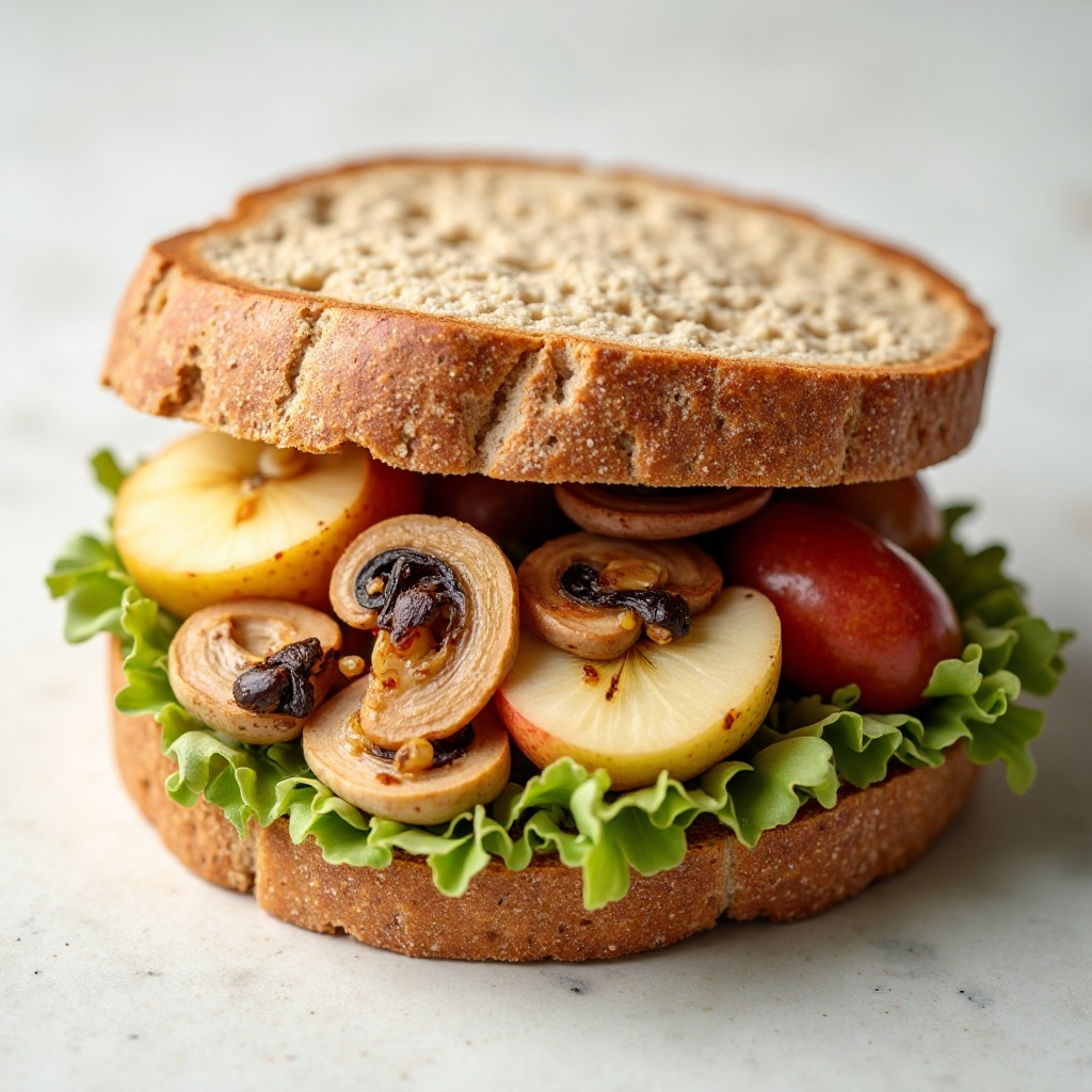6. Cierra el sándwich con la otra rebanada de pan. Sirve inmediatamente y disfruta del contraste entre el queso fuerte, los champiñones suaves y la frescura de las frutas.
