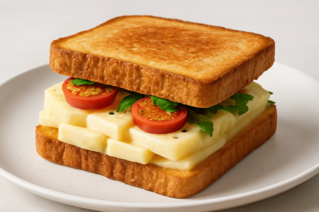 4. Monta el sándwich: Cierra el pan para formar un sándwich. Sirve caliente, si lo prefieres, o frío según tu gusto.