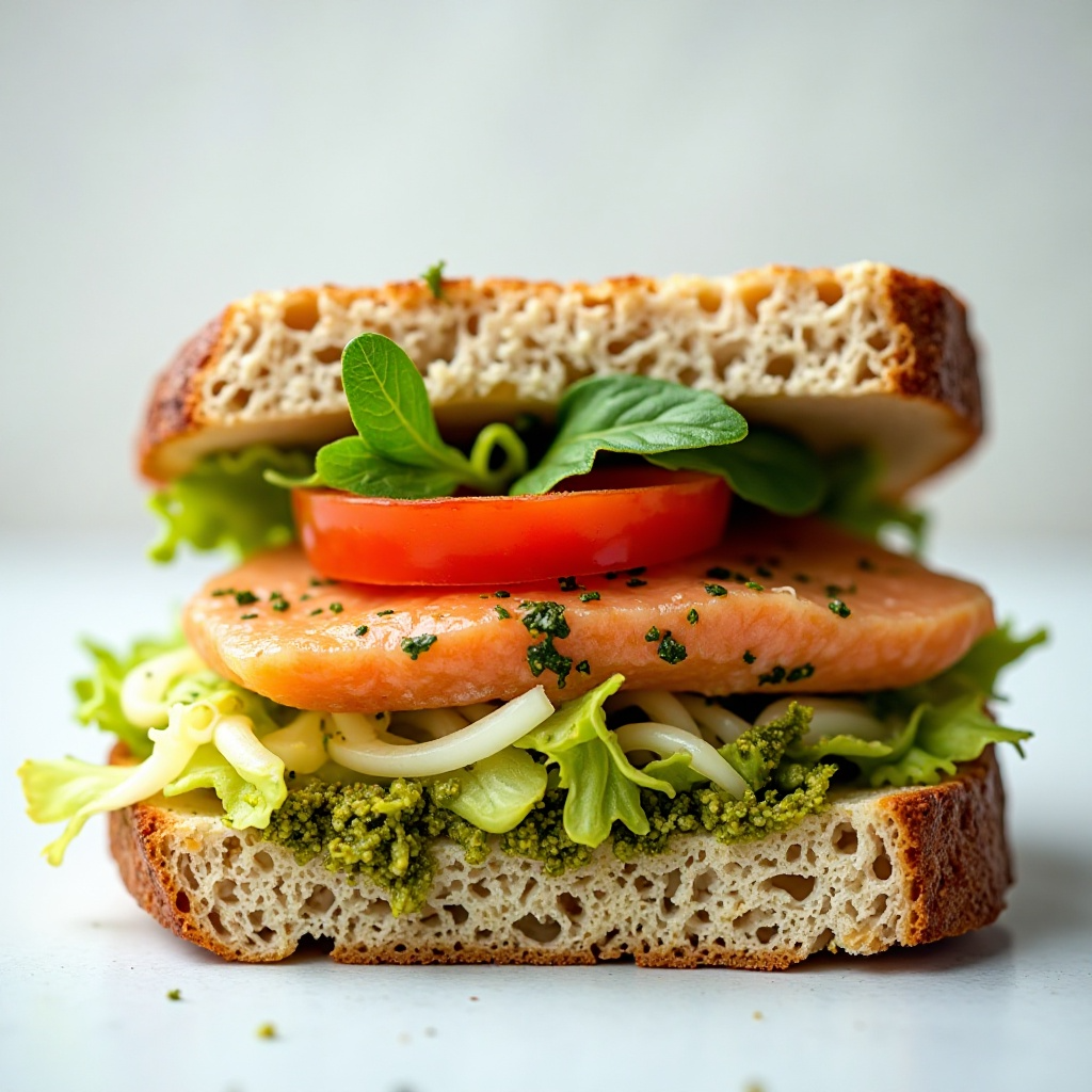 El sándwich es una opción saludable si se elige el pan integral y se limita la cantidad de pesto. La trucha ahumada es baja en grasa y rica en proteínas, mientras que el chucrut encurtido aporta beneficios para el sistema digestivo. El tomate cherry es una fuente natural de vitaminas y antioxidantes.