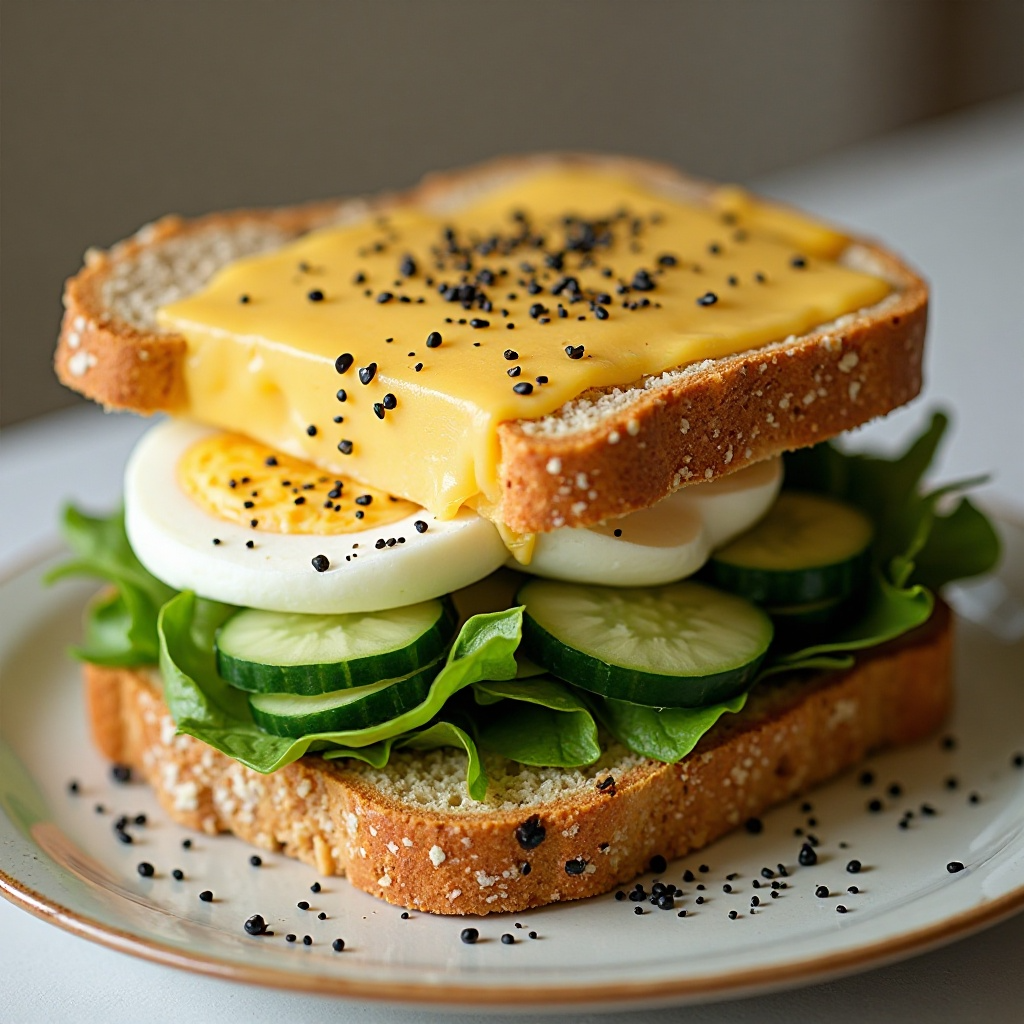 Este sándwich es una opción saludable debido a su uso de pan integral rico en fibra y verduras frescas. La combinación de queso cremoso con el contraste del queso azul añade variedad nutricional con proteínas de alta calidad. Para una versión baja en calorías, considera reducir la cantidad de queso o reemplazarla por queso de cabra o requesón.