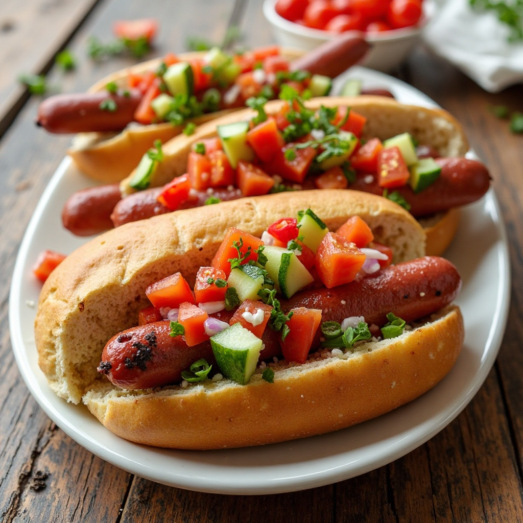 3. Una vez que los hot wieners estén listos, retíralos de la parrilla y colócalos en cada panecillo de hot dog. Esparce generosamente la mezcla de verduras sobre cada wiener.