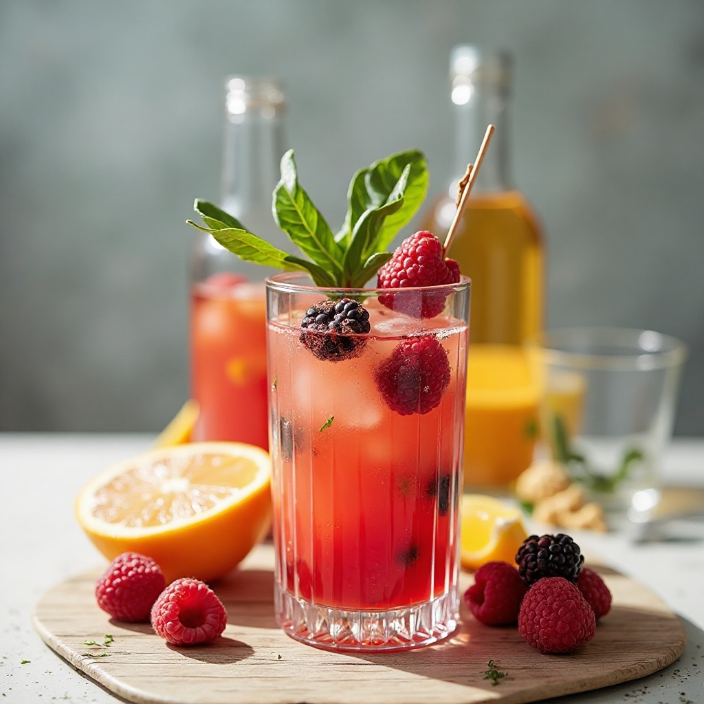 - Agrega las frambuesas, moras, jengibre fresco y hierbas aromáticas al recipiente. Deja reposar por unos 30 minutos para que los sabores se mezclen.