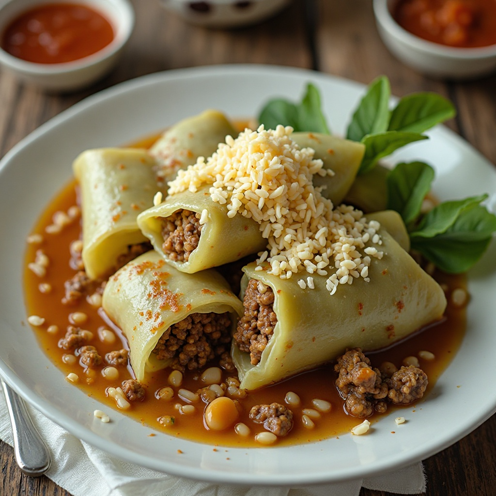 - Llena cada hoja de col o repollo con una porción generosa de la mezcla de carne y arroz, asegurándote de no sobrecargarlas para que se puedan enrollar fácilmente.