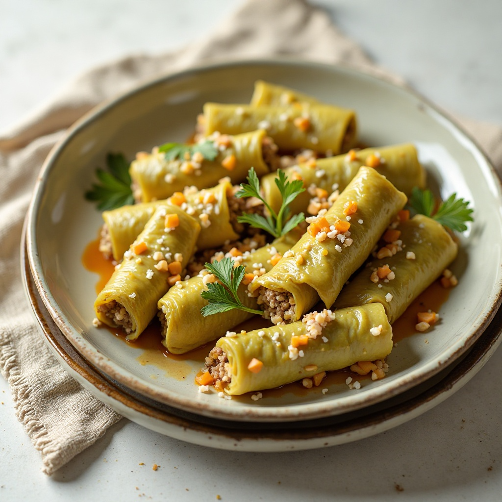 4. Cierra cada hoja sobre sí misma, formando un rollito, y envuelve bien para asegurar que el relleno permanezca dentro durante la cocción.