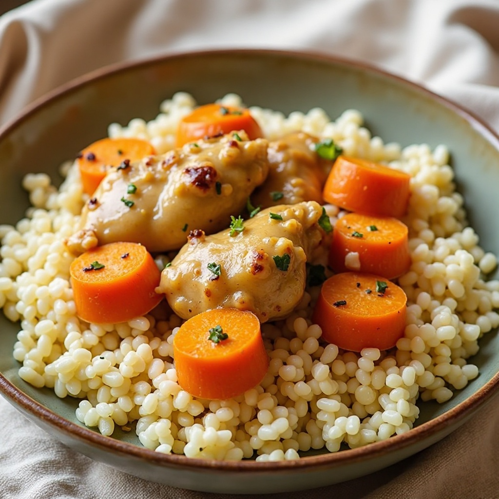Este plato es rico en proteínas magras y contiene vegetales como las zanahorias, que son una excelente fuente de vitamina A. Sin embargo, el arroz sémola puede ser una fuente de carbohidratos. Para una versión más ligera, considera reducir la cantidad de mantequilla o usar aceite de oliva en su lugar. Además, al preparar el pollo, asegúrate de cocinarlo a fuego medio para evitar que se queme y quede excesivamente grasoso.