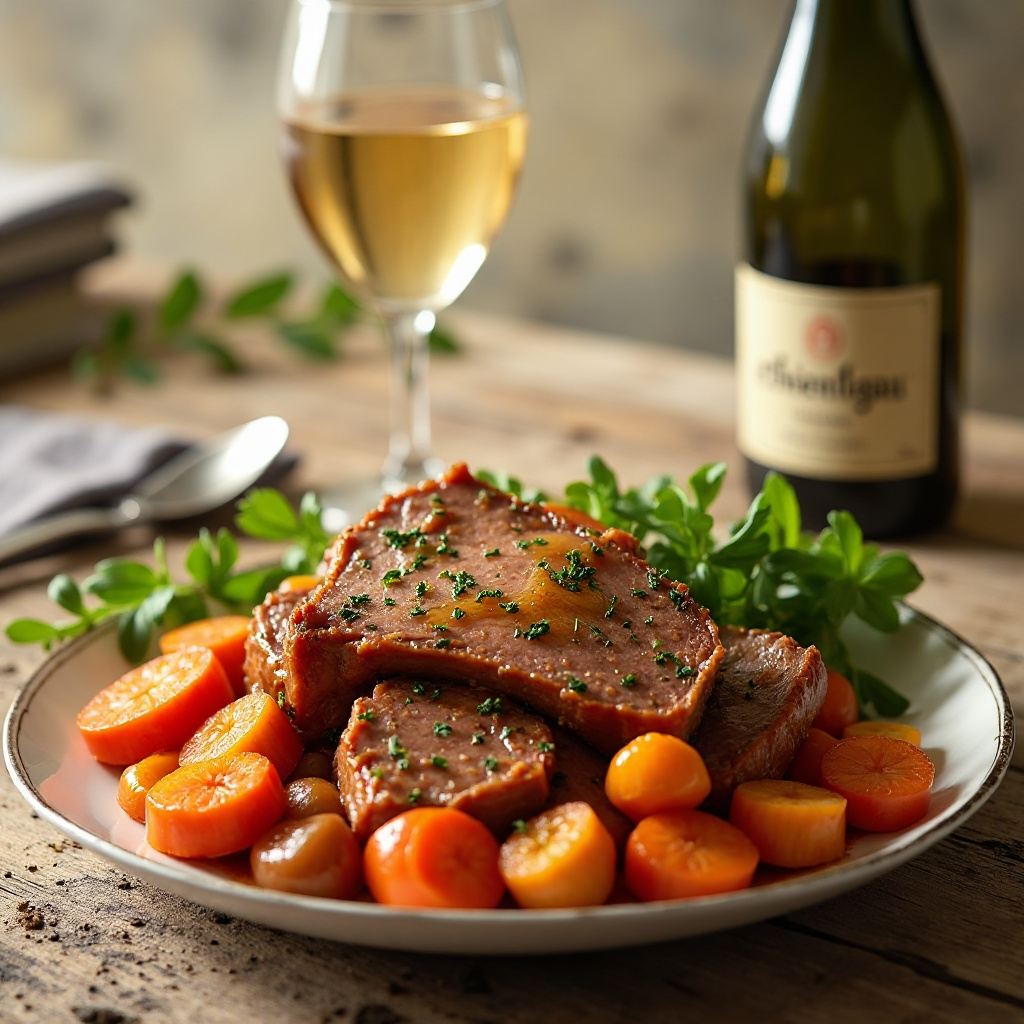 4. Sirve la Sauerbraten con las verduras y las patatas en platos individuales, acompañándola con una copa de vino Rheingau para Wiesbaden para apreciar sus notas únicas.