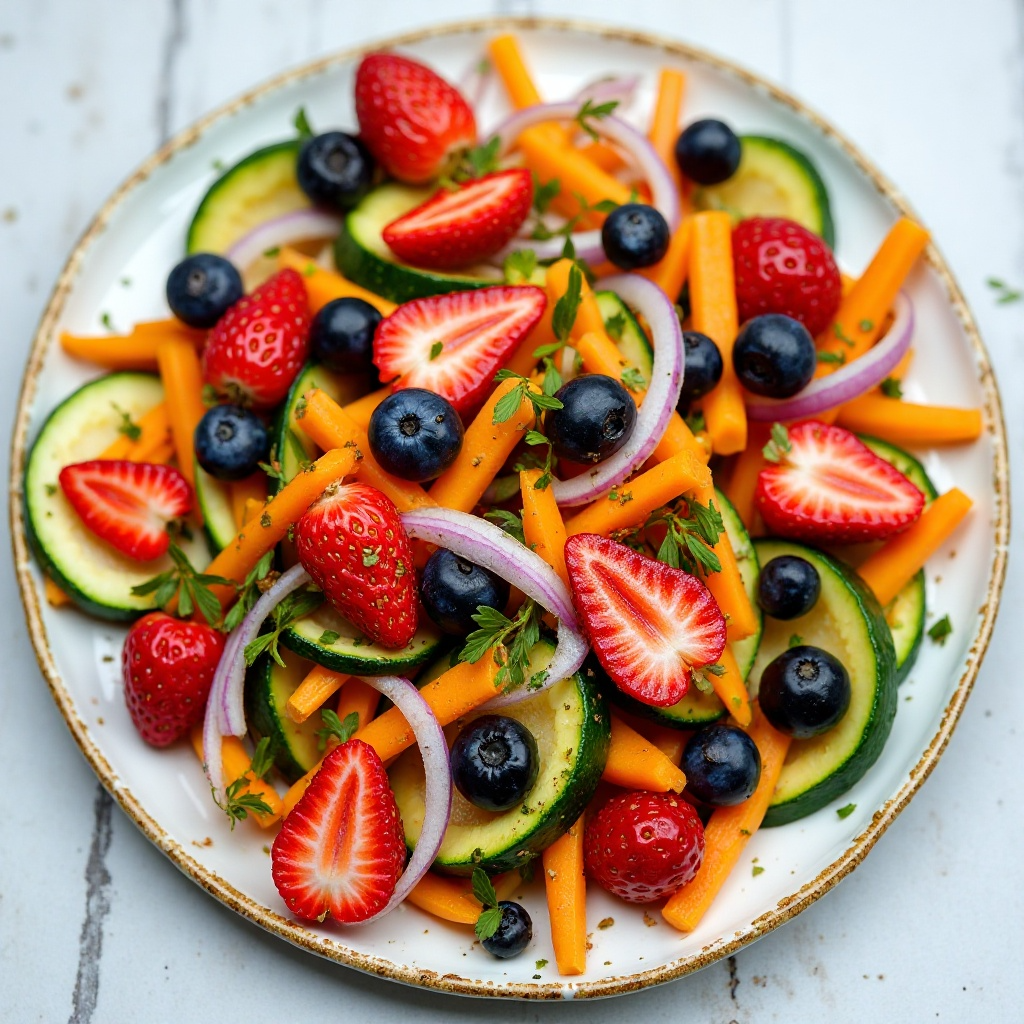 Este plato es rico en antioxidantes gracias a las fresas silvestres y los arándanos, que combaten el estrés oxidativo. Además, las verduras ofrecen vitaminas y fibra esenciales, haciendo de esta receta un plato balanceado para la dieta.