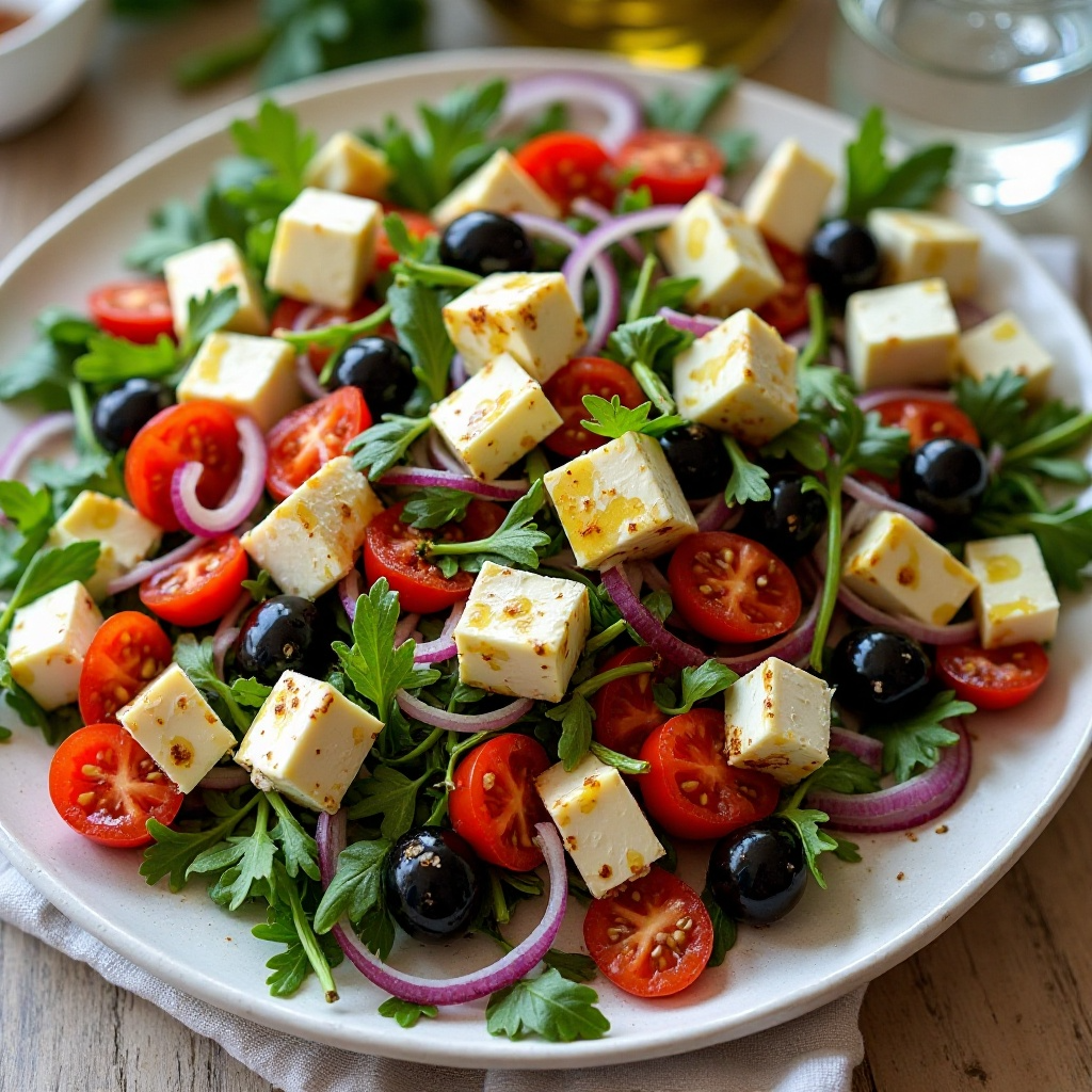 Esta ensalada es baja en calorías y rica en antioxidantes gracias a las verduras frescas. El queso feta añade proteínas sin mucho contenido graso, mientras que el aceite de oliva y el vinagre balsámico aportan grasas saludables y sabor ácido, respectivamente. Beber vino re tsina con moderación puede ser parte de una dieta equilibrada, dada su riqueza en polifenoles beneficiosos para la salud.
