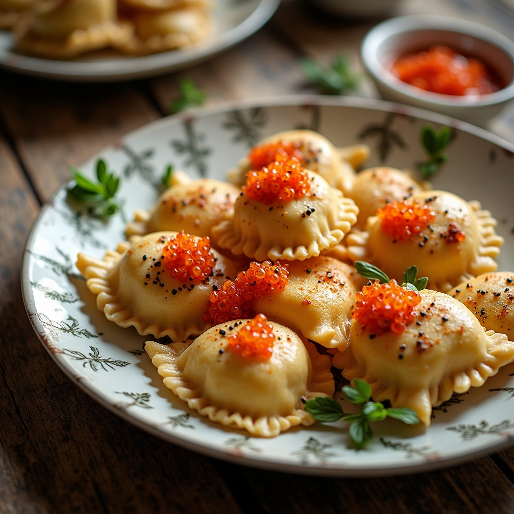 - Sirve los raviolis calientes y déjalos reposar durante unos minutos antes de añadir la capa final de caviar rojo, adornando con un toque delicado para mantener su lujosa textura.