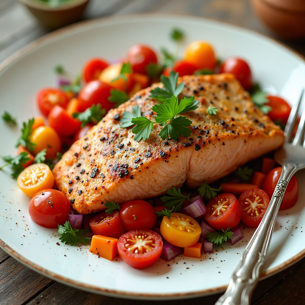 Este plato presenta un perfil nutricional excelente gracias a su contenido en proteínas de calidad del salmón, vitaminas y minerales de las verduras, y el aceite de oliva que contribuye con ácidos grasos saludables. Es ideal para aquellos que buscan una opción ligera y sabrosa que se alinee con dietas basadas en alimentos enteros.