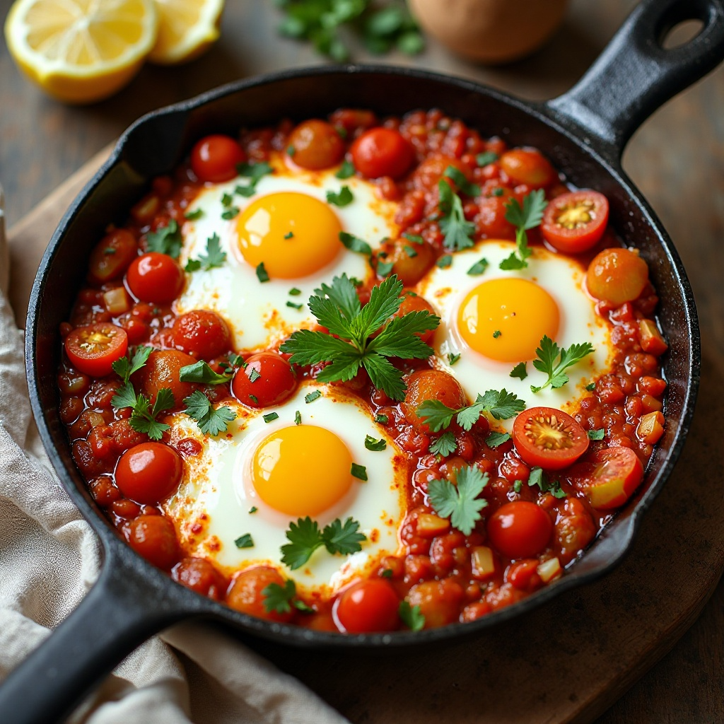 - Sirve inmediatamente el shakshuka caliente, decorando con cilantro fresco y un chorrito de zumo de limón.