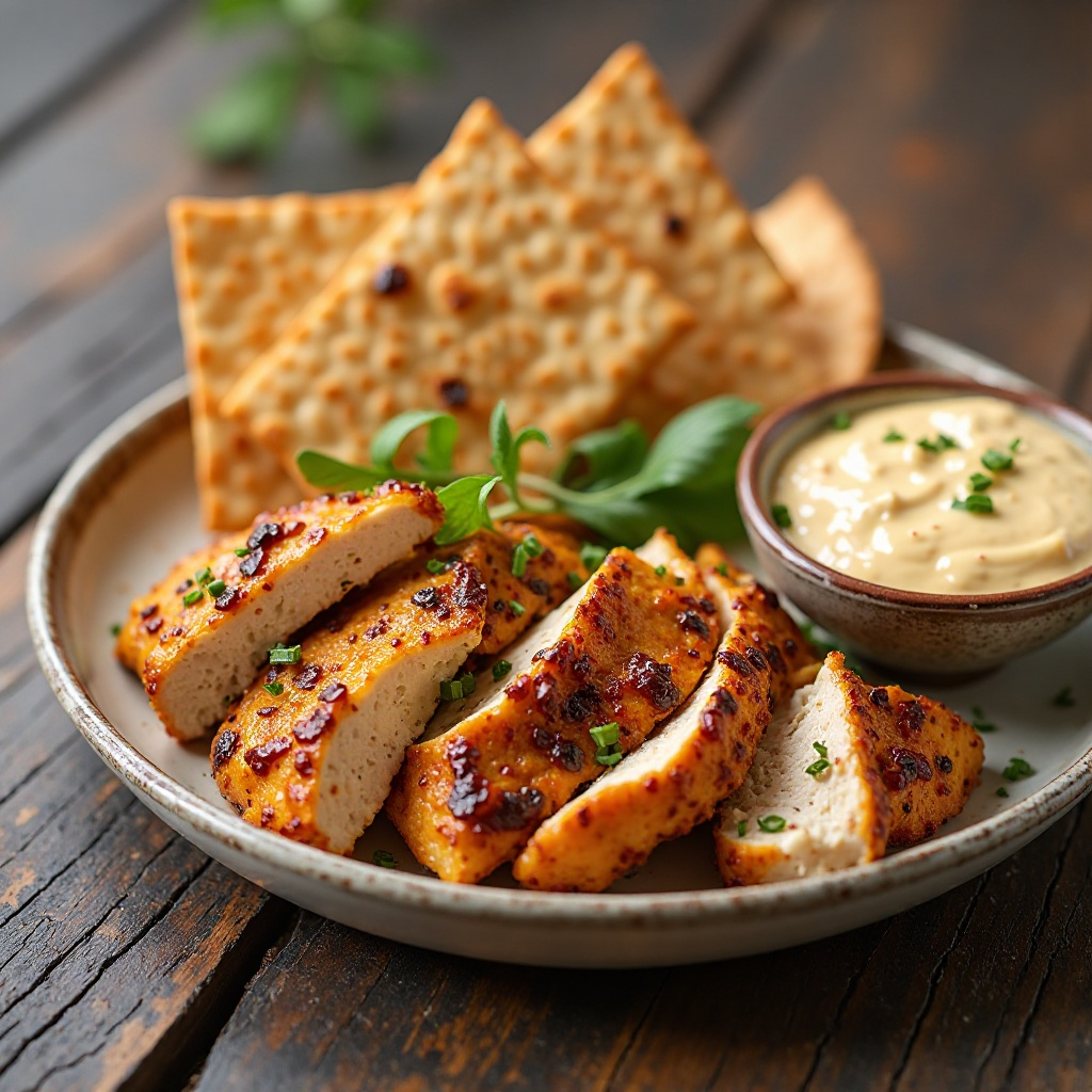 El pollo es una excelente fuente de proteínas magras y contiene vitamina B3, que es importante para el metabolismo. La salsa tahín aporta grasas saludables y fibra, mientras que las galletas de centeno son ricas en minerales como hierro y calcio. Para una versión aún más saludable, considera usar pollo orgánico y reemplazar algunas galletas por una ensalada fresca.