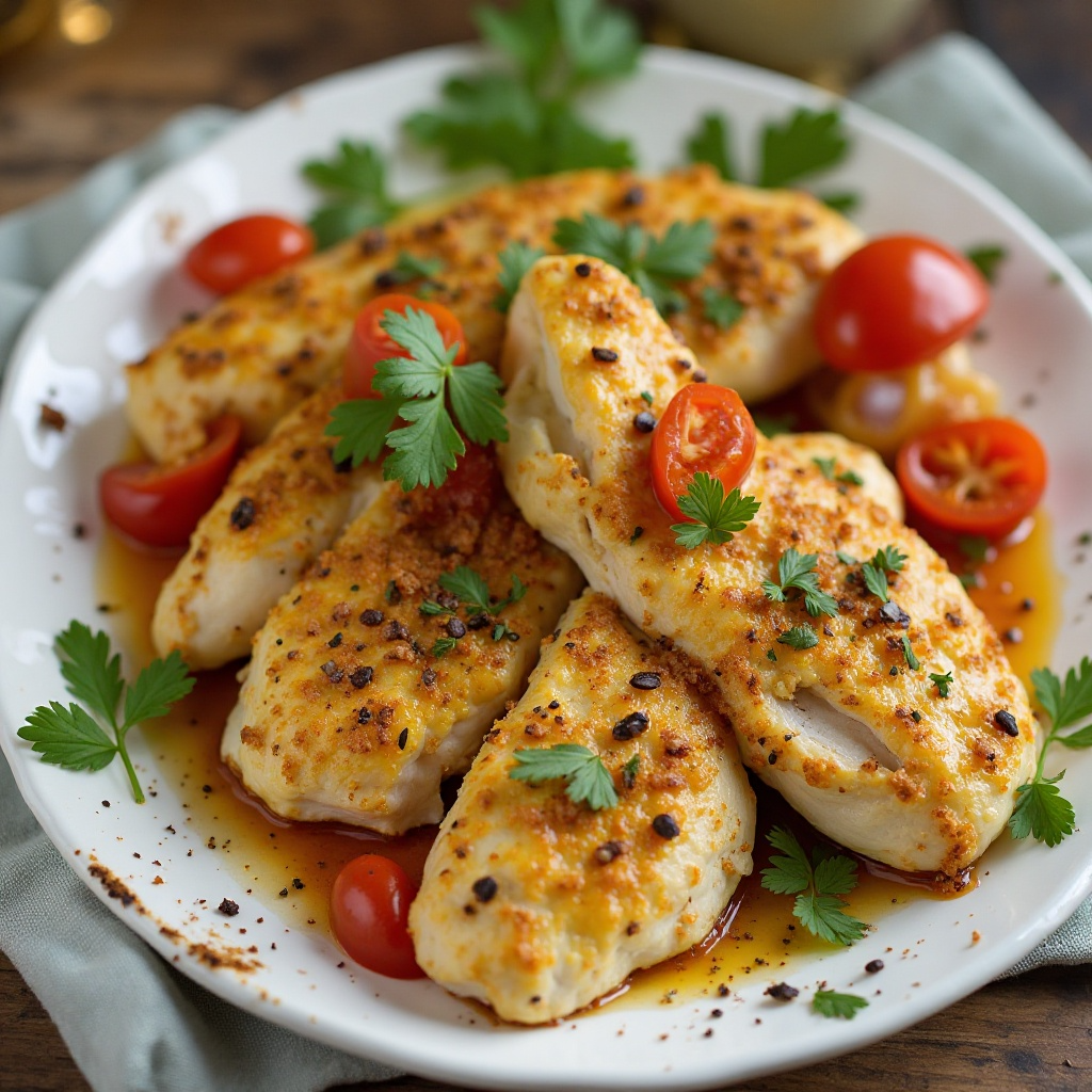 - Coloca el pollo en una bandeja para horno forrada con papel pergamino. Hornea a 180°C durante aproximadamente 30-40 minutos, hasta que el pollo esté bien cocido y la piel esté dorada.