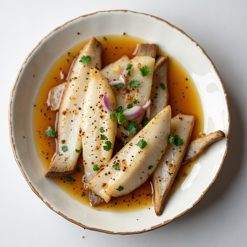 1. Limpia y corta el filete de pescado en láminas delgadas, aproximadamente 1 mm de espesor. Trata de mantener las láminas lo más uniformes posible para asegurar que se cocinen de manera pareja.